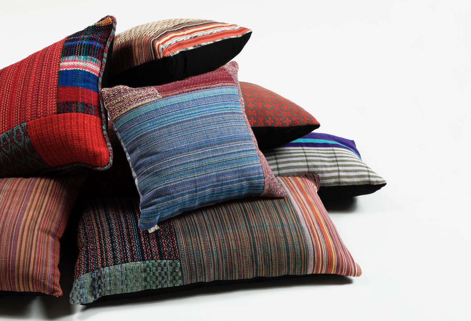 One-of-a-kind decorative pillows, ottomans and meditation cushions created as part of a zero waste series made from smaller pieces of handwoven fabric cut-offs.